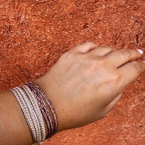 Découvrez la beauté du bracelet Sahara aux teintes dorées lumineuses et de bordeaux intense. Tressé avec soin en trois brins élégants, il reflète la chaleur et la profondeur des paysages du désert marocain. Il peut être porté seul pour un style épuré ou en accumulation pour un effet sophistiqué. Fabriqué avec amour au Maroc ….