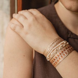 Le bracelet associe raffinement et modernité grâce à son alliance de couleurs Rose Gold et Mocha. Il apportera une touche d’élégance à toutes vos tenues, qu’elles soient décontractées ou habillées. Fabriqué avec amour au Maroc . Façonné avec des fils métallisés dorés, subtilement mêlés à de la soie ou du coton selon la technique traditionnelle…
