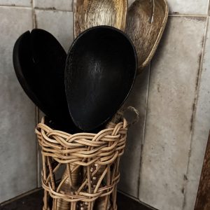 Le set de deux couverts Mykonos, fabriqué en bois de manguier brûlé et doté de manches en rotin. Épuré, authenticité et modernité sont au rendez-vous avec ce joli set. Fabriqués avec amour, en Inde Matières : bois de manguier brûlé et bambou Couleur : brun foncé Entretien : lavage à la main recommandé