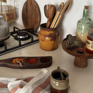 Ensemble de deux couverts à salade sculptés à la main en bois de manguier, avec manches en rotin tressé au motif géométrique. Chaque pièce est unique, grâce aux variations naturelles de teintes et aux veinures du bois de manguier. Fabriqués avec amour, en Inde Matières : bois de manguier et bambou Couleurs : teinte naturelle…