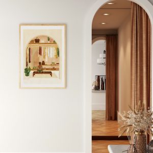 Cette illustration vous invite dans un univers apaisant, qui capture un moment de sérénité dans un dressing entouré de textiles légers et de teintes naturelles. Créée avec amour en France Illustration originale à l’aquarelle Taille M : 29,7 x 39 x 7 cm Papier certifié FSC (issus de forêts gérées de manière responsable)