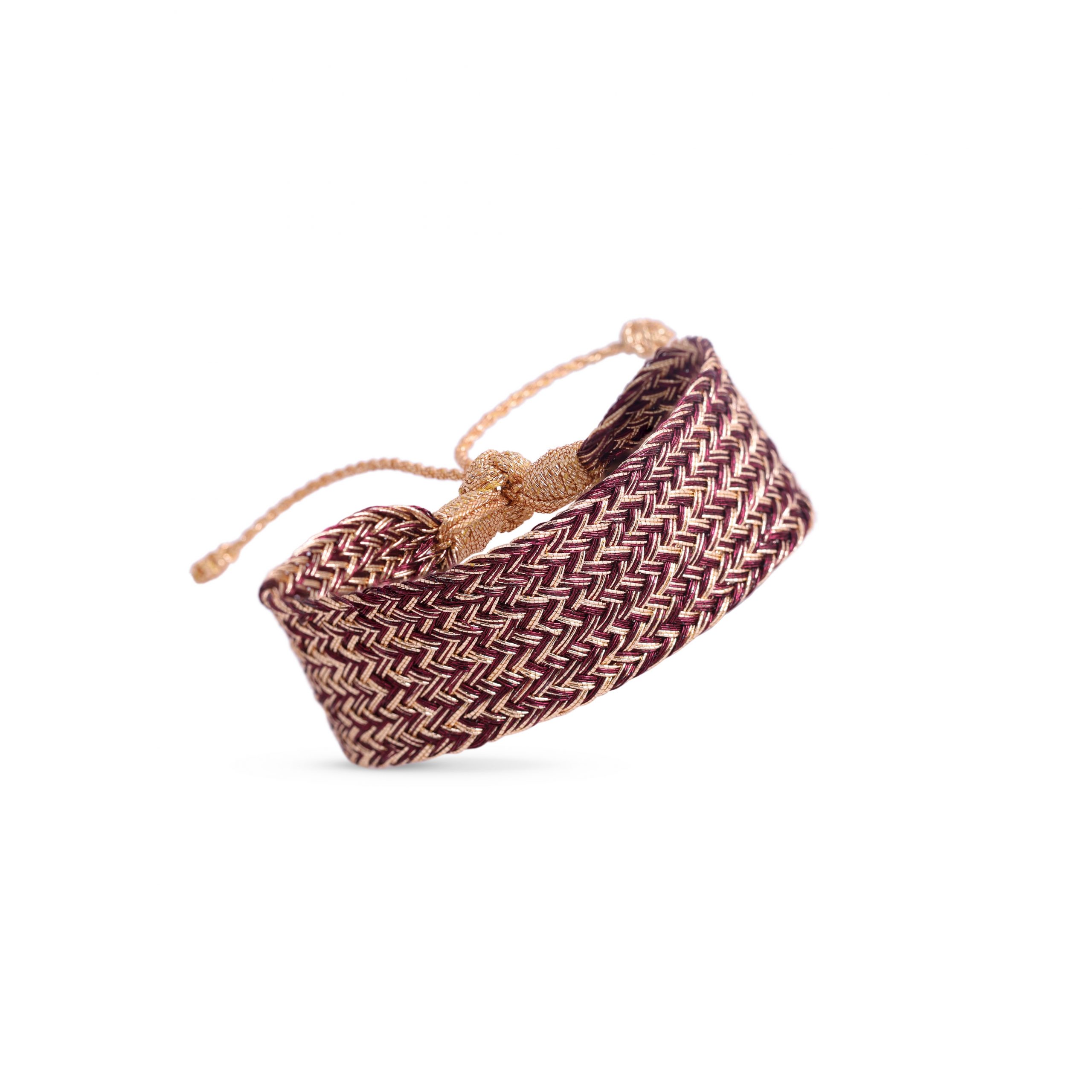 Inspirée par la beauté mystérieuse des paysages désertiques, cette création unique apporte une note d’élégance et de caractère à toutes vos tenues. Elle séduit par son alliance audacieuse entre l’éclat du doré et la richesse des tons prune.